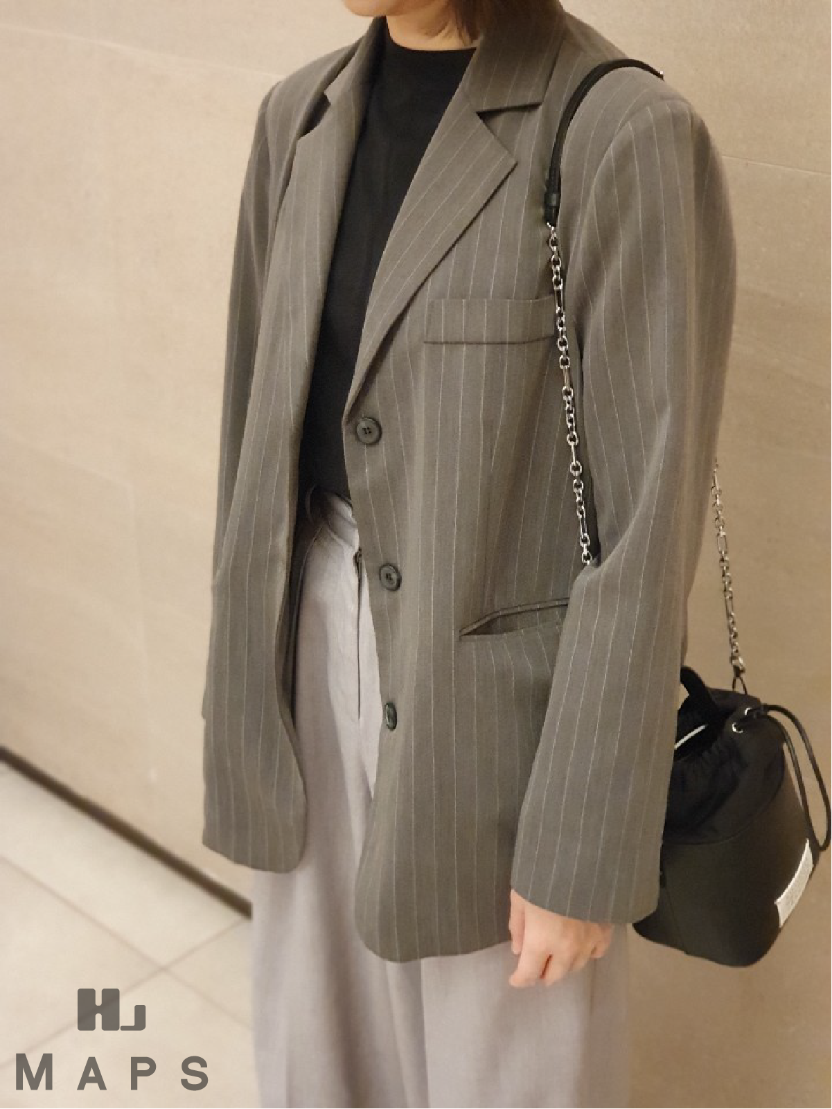 그레이 기반의 톤온톤 룩에 이너웨어로 블랙을 선택하여 차분한 느낌을 줍니다. 가방또한 톤의 통일로 색상 조합이 안정감이 느껴집니다.